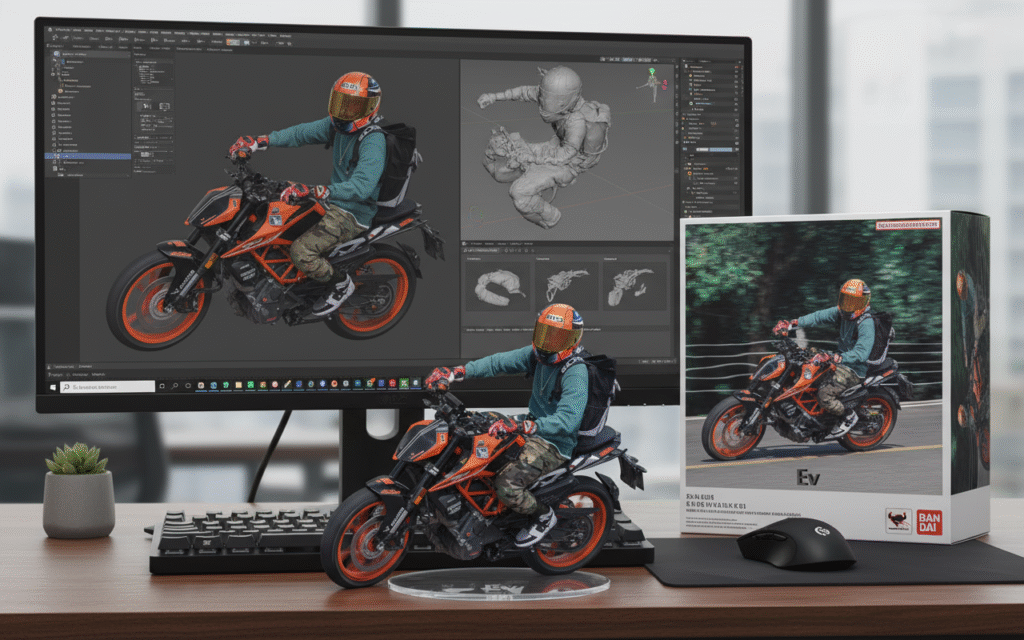 Contoh prompt yang dipakai di blog ini adalah: "Model figure komersial skala 1/7 berdasarkan karakter ilustrasi, diletakkan di desktop komputer dengan alas akrilik transparan berbentuk lingkaran tanpa tanda teks. Layar komputer menampilkan proses pemodelan ZBrush untuk karakter ini. Di samping layar terdapat kotak kemasan mainan bergaya Bandai dengan artwork asli."