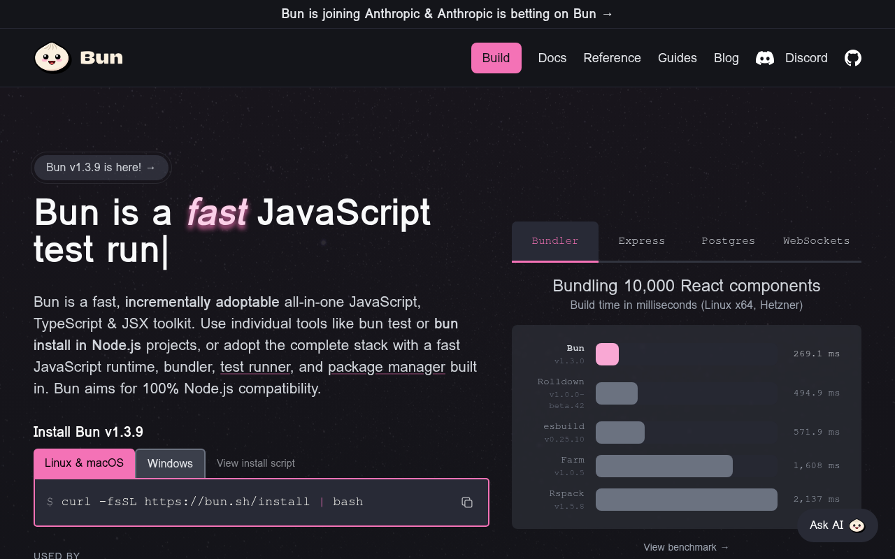 Bun adalah runtime JavaScript all-in-one yang mencakup bundler, transpiler, dan package manager dengan performa yang sangat tinggi.