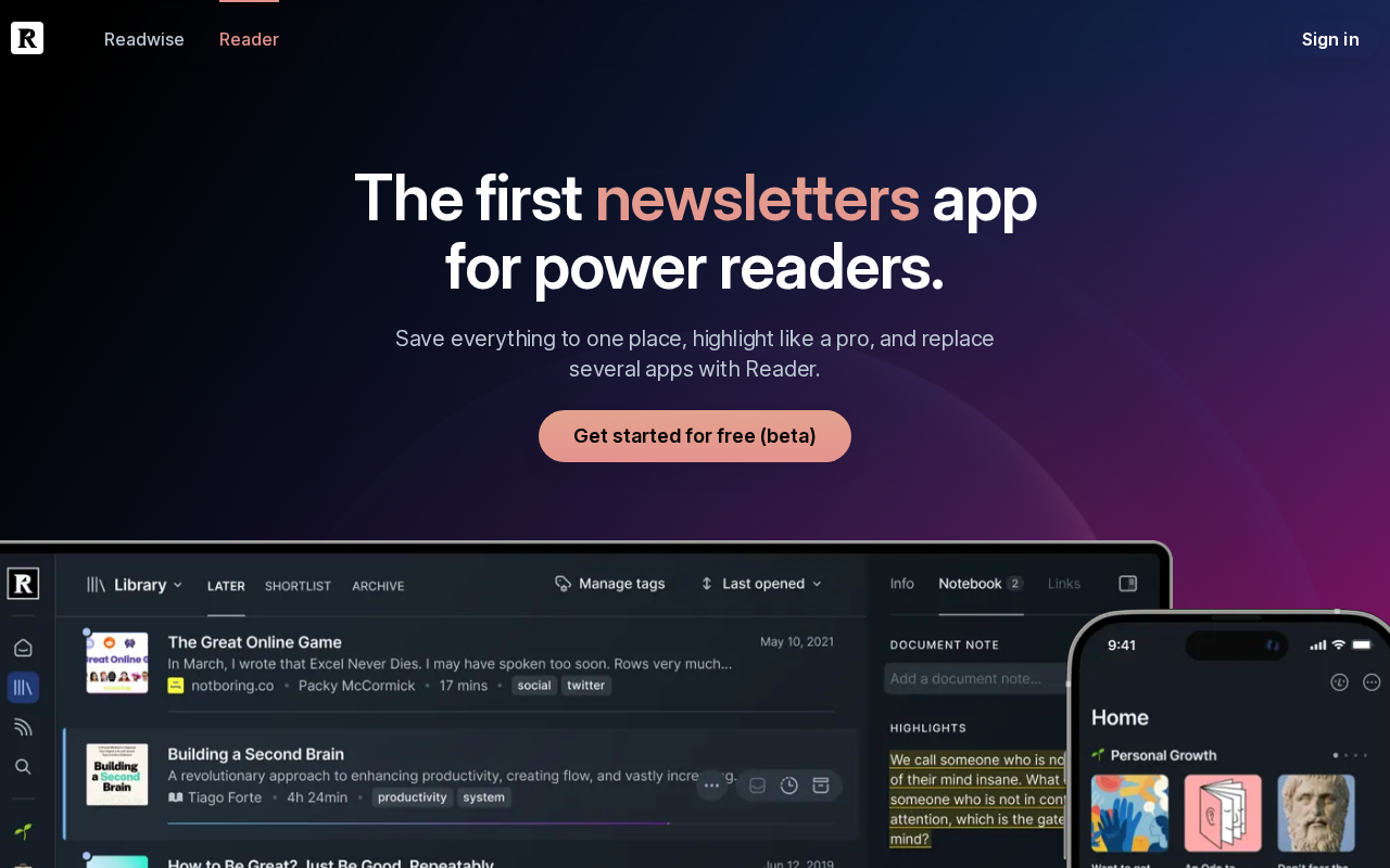 Reader adalah aplikasi read-it-later untuk power user, mendukung artikel, PDF, newsletter, dan RSS dengan fitur highlight yang kuat.