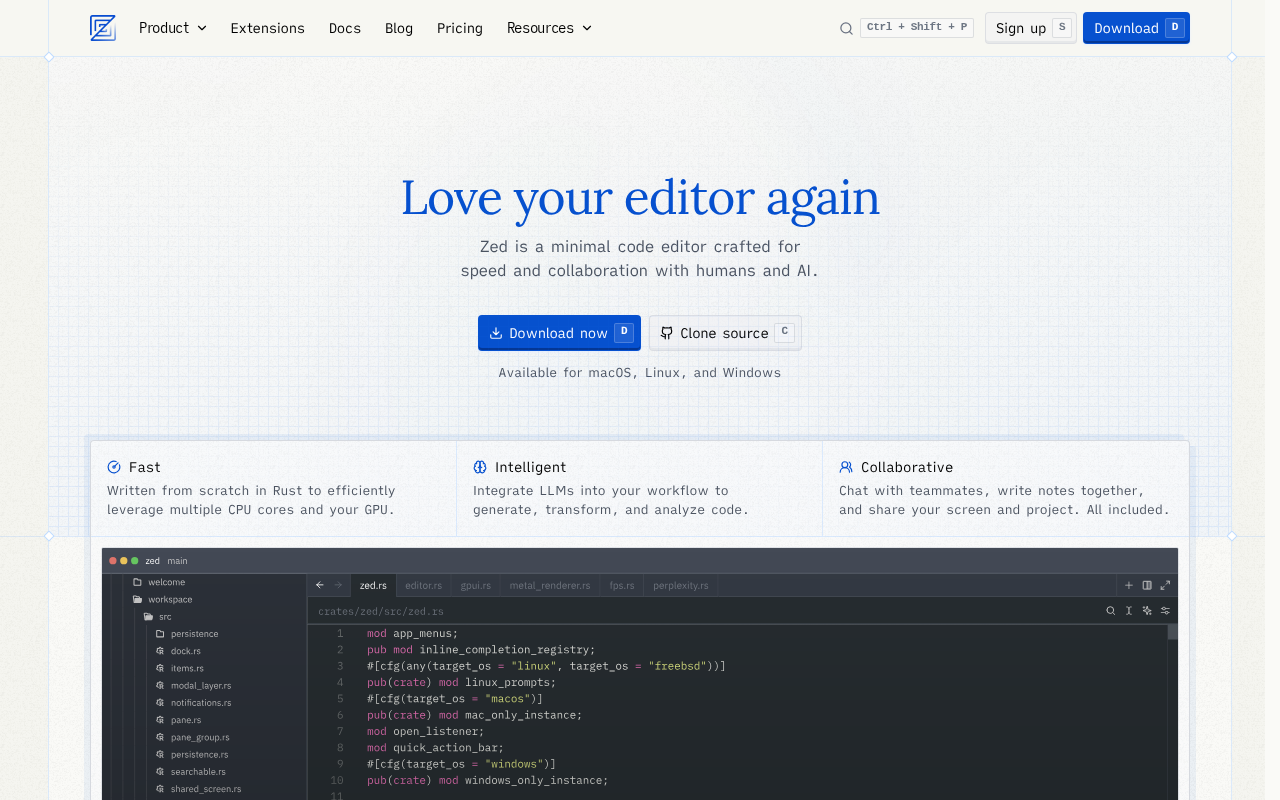Zed adalah editor kode multiplayer berkinerja tinggi yang dibuat oleh pencipta Atom dan Tree-sitter, ditulis dengan Rust.